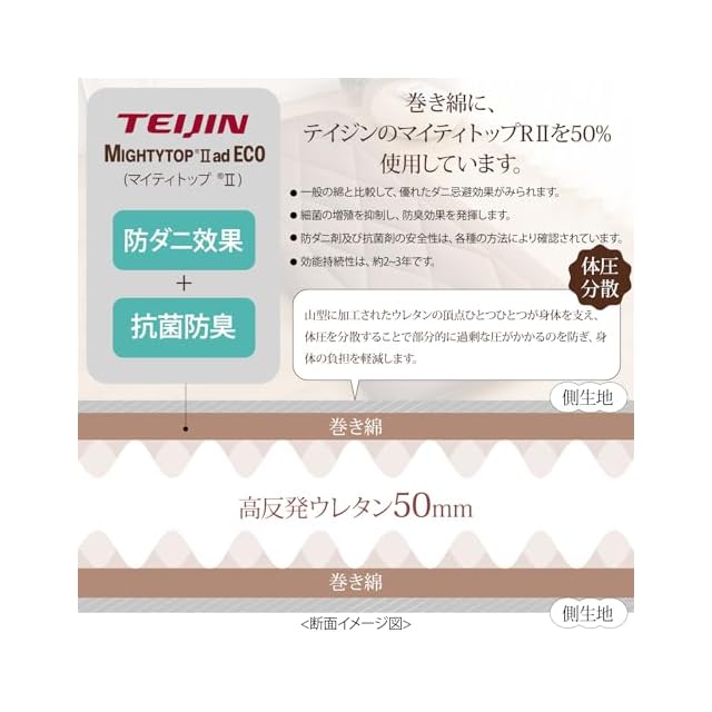 【「マイティートップⅡECO」を使用】中綿には防ダニの高機能素材、帝人のマイティトップⅡを採用しており、お子様がいるご家庭や、アレルギーなどが心配な方におすすめです。防ダニ・抗菌防臭機能があるテイジン「マイティートップⅡECO」が50%使用されています。