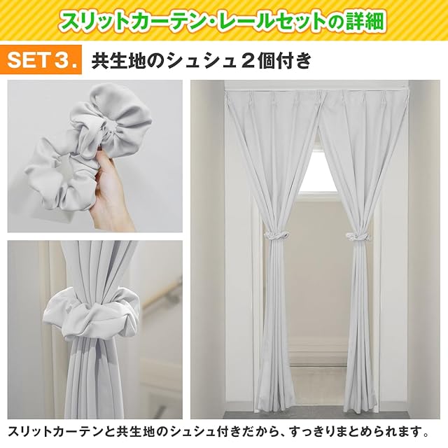 スリットカーテンと突っ張り式伸縮カーテンレールと共生地シュシュのセットです。※スリットカーテンを改良しました。お客様のお声をもとに、ヒダとヒダの間隔を狭くして縫製することで、たるみにくく見た目がきれいになりました。