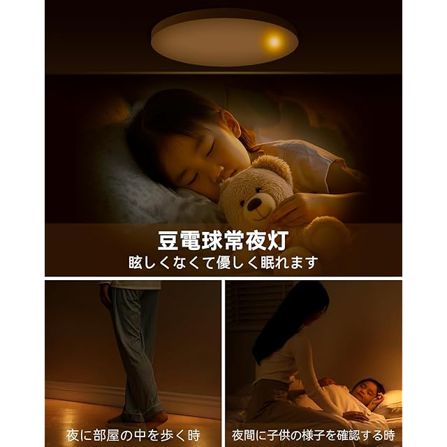 ⭐【豆電球常夜灯・記憶機能・定刻消灯】○本格的な豆電球常夜灯(1W):他社の眩しい全体発光式常夜灯と違って、1点だけ発光のため、ちょうどいい感じの暗さで目への刺激がなく、付けまま寝ることに最適です。○進化した記憶機能:他社の記憶機能は常夜灯によって前の設定がリセットされる方が多く、当天井照明器具はいろいろ設定してから常夜灯を使っても、次回点灯時にきちんと常夜灯前の設定を再現しますので、設定がリセットされるため毎日設定し直しの悩みがなくなります!○消灯機能:設定して15/30分後自動的に消灯するため、消し忘れの心配はありません。