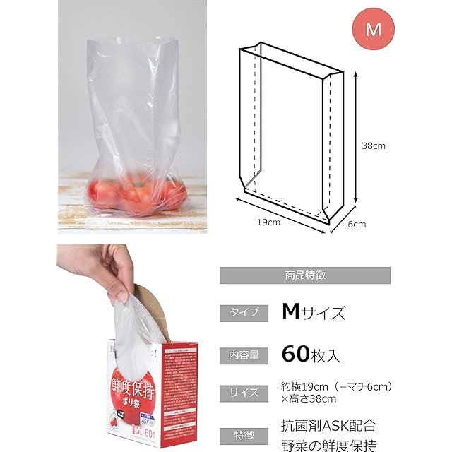 商品名:ストリックスデザイン ポリ袋 野菜保存袋 マチ付き 60枚 M 小 半透明 トマトが4個入るサイズ 抗菌剤配合 鮮度保持袋 新鮮 SA-096
