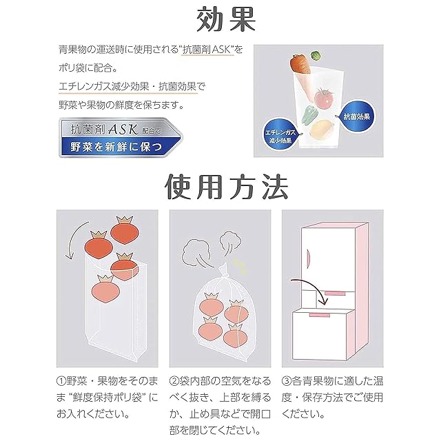 【鮮度 長持ち】抗菌剤を配合した野菜や果物の鮮度を保持するキッチンパックです。抗菌剤により野菜や果物から放出されるエチレンガスを減少、抗菌効果により鮮度を保持します。
