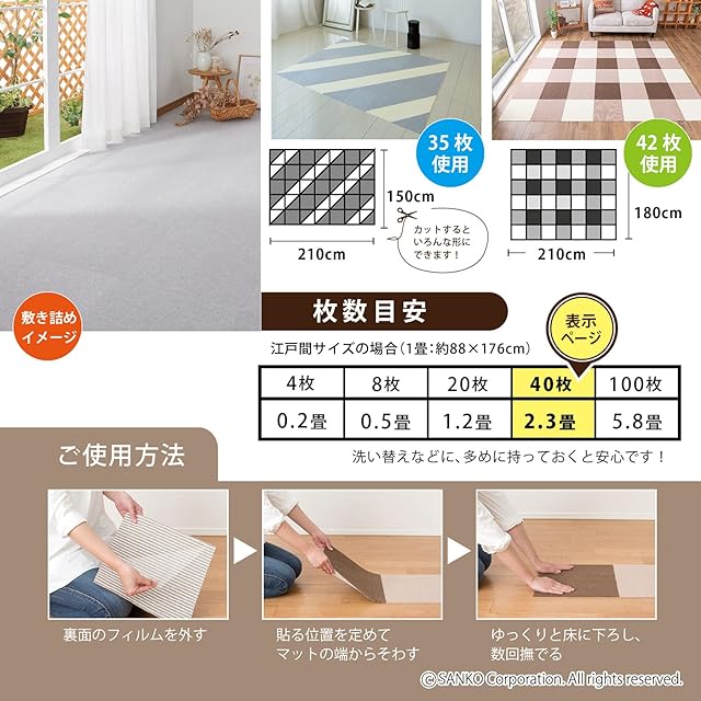 【2.3畳分】 サイズ : 40枚組〈約3.6㎡〉 30×30cm(厚み4mm)、重量:50g(1枚)