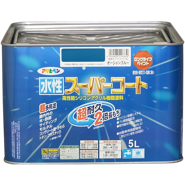 商品名:アサヒペン 水性スーパーコート 5L オーシャンブルー 塗料 ペンキ シリコンアクリル塗料 ツヤあり 1回塗り 超耐久 多用途 さび止め剤配合 防カビ剤配合 紫外線劣化防止剤配合 シックハウス対策品 日本製