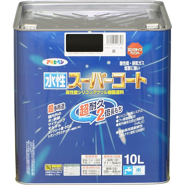 商品名:アサヒペン 水性スーパーコート 10L 黒 塗料 ペンキ シリコンアクリル塗料 ツヤあり 1回塗り 超耐久 多用途 さび止め剤配合 防カビ剤配合 紫外線劣化防止剤配合 シックハウス対策品 日本製