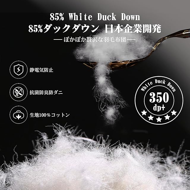 【100%天然素材】側生地:100%コットン 詰め物:ダックダウン 純綿とDevroux防音生地を採用することで、寝返りの音を30dBまで抑え、浅い睡眠をやさしく守ります。