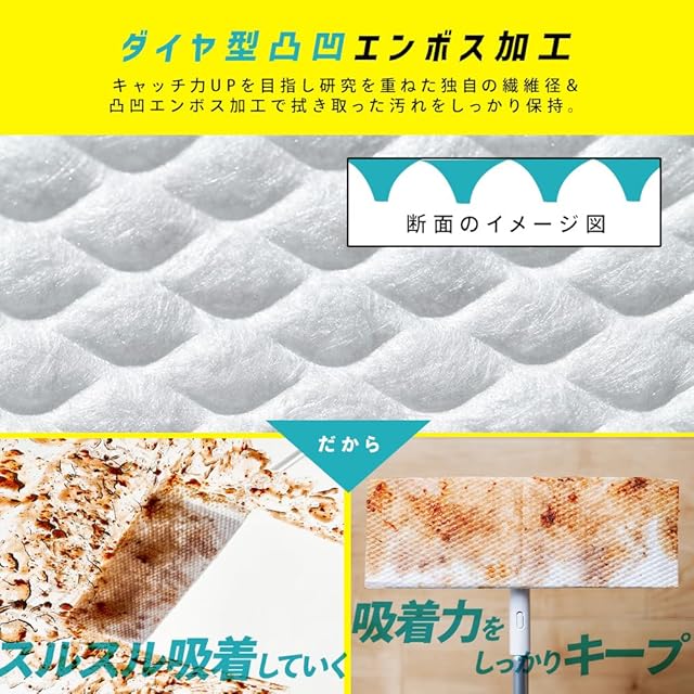 キャッチ力UPを目指し研究を重ねた独自の繊維径&凹凸エンボス加工でふき取った汚れをしっかり保持。