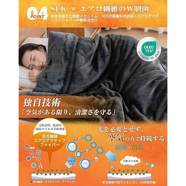 【SEK抗菌防臭×非光触媒のW制菌】SEK認証済みの素材に、エアロアクティブファイバーの酸素活性化技術を組み合わせることで、空気がある限り24時間持続的に制菌・消臭を発揮。低ホルムアルデヒド設計で、お子様にも配慮した仕様です。洗濯を繰り返しても抗菌・防臭・防ダニ効果が持続。