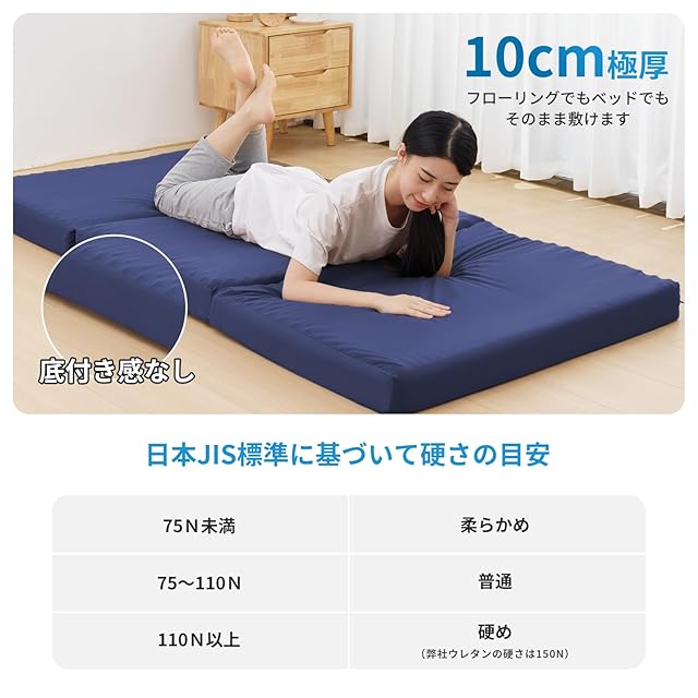 商品名:HOMFINE 高反発マットレス シングル 三つ折り 極厚10cm 20D おりたたみマットレス 高反発 ベットマット 敷き布団 凹凸加工 体圧分散 程良い硬さ 抗菌防臭 洗えるカバー 通気性がよい オールシーズン 97x195x10cm ネイビー