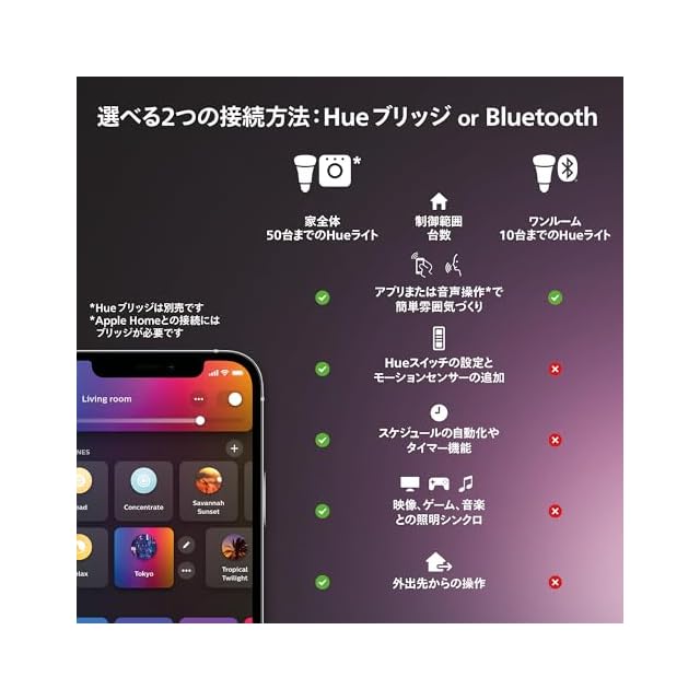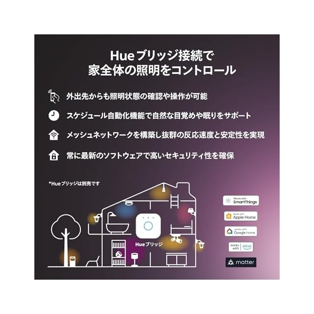 【家全体の照明コントロールに最適】 家全体の照明をコントロールする場合は、Hue ブリッジを使うことで、最大50個の照明を安定して確実な操作を実感いただけます。例えば、外出時に家中の照明を一括消灯できたり、1階に居ながら2階の照明操作ができます。