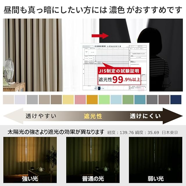 【1級遮光】迷ったらこれ!シンプル&機能性重視の方におすすめです。この2枚セット(1級遮光ドレープカーテン2枚)を選択する理由:①光沢を抑えたマットな質感が美しい。②黒ずみの少ないなめらかな生地。③快適に過ごせる優れた性能。遮光率99.9%以上、日差しの強い窓でもしっかりと遮光できるので、光をできる限りシャットアウトしたい方におすすめです。