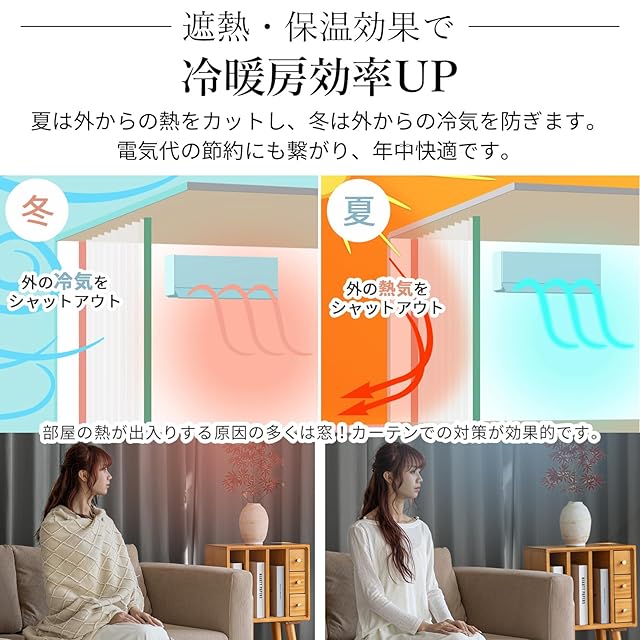 【遮熱保温·形状記憶】届いてすぐ使えるドレープカーテン2枚、同色タッセル付きます。夏は外の熱気をカットし、室温の上昇を抑え冷房効率アップします。冬は外の冷気を遮り、室内の暖かい空気を逃がさないので暖房効率もアップします。ペットにも1年中快適に過ごせます。洗濯機でまるごと洗えます。お手入れしやすいのでいつも清潔に使用できます。カーテンの重みで洗濯ジワも伸ばすことができので、形態安定としてはとても効果が期待できます。