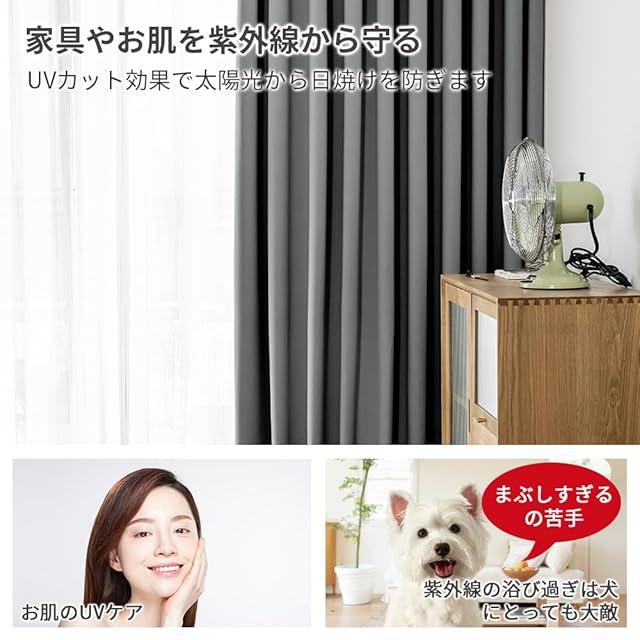 【ペットと人のためUVカット】このカーテンを使えば、紫外線をカットすることによってお肌も守るし、家具の日焼けや色褪せ防止にも働きます。また、犬の目は人間よりも紫外線に弱いと言われております。紫外線は犬の皮膚にもダメージを与えるので、浴び過ぎなら犬にとっても大敵です。そのため、UVカット効果で大切なペットを紫外線から守れます。