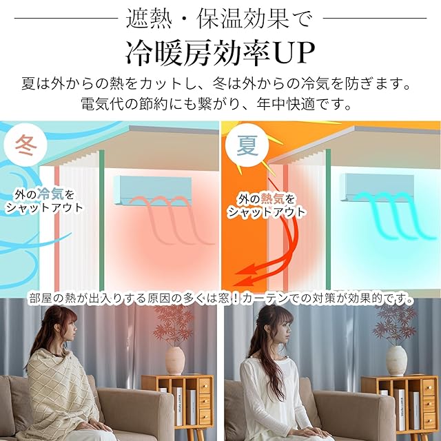 【遮熱保温·形状記憶】届いてすぐ使えるドレープカーテン2枚、同色タッセル付きます。夏は外の熱気をカットし、室温の上昇を抑え冷房効率アップします。冬は外の冷気を遮り、室内の暖かい空気を逃がさないので暖房効率もアップします。ペットにも1年中快適に過ごせます。洗濯機でまるごと洗えます。お手入れしやすいのでいつも清潔に使用できます。カーテンの重みで洗濯ジワも伸ばすことができので、形態安定としてはとても効果が期待できます。