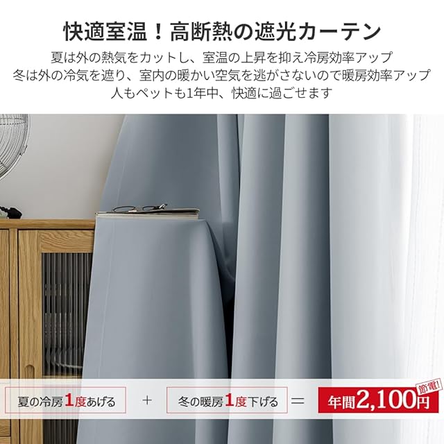 【遮熱保温·形状記憶】届いてすぐ使えるドレープカーテン2枚、同色タッセル付きます。夏は外の熱気をカットし、室温の上昇を抑え冷房効率アップします。冬は外の冷気を遮り、室内の暖かい空気を逃がさないので暖房効率もアップします。ペットにも1年中快適に過ごせます。洗濯機でまるごと洗えます。お手入れしやすいのでいつも清潔に使用できます。カーテンの重みで洗濯ジワも伸ばすことができので、形態安定としてはとても効果が期待できます。