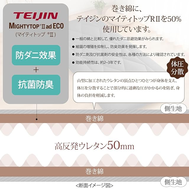 【「マイティートップⅡECO」を使用】中綿には防ダニの高機能素材、帝人のマイティトップⅡを採用しており、お子様がいるご家庭や、アレルギーなどが心配な方におすすめです。防ダニ・抗菌防臭機能があるテイジン「マイティートップⅡECO」が50%使用されています。