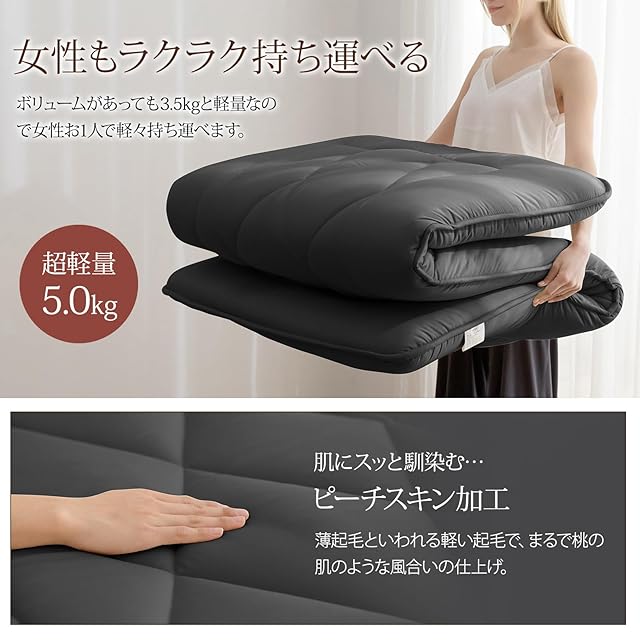 商品名:fuwawa 敷き布団 ダブル 敷布団 厚め 10cm ボリューム 軽量 五層構造 三つ折り ピーチスキン 体圧分散 ウレタン入り 高級 折り目なし TEIJIN「マイティトップⅡ」中綿使用 オールシーズン 抗菌防臭 防ダニ 洗える しき布団 マットレス 一人暮らし 来客用布団 厚手 140×210cm ブラック