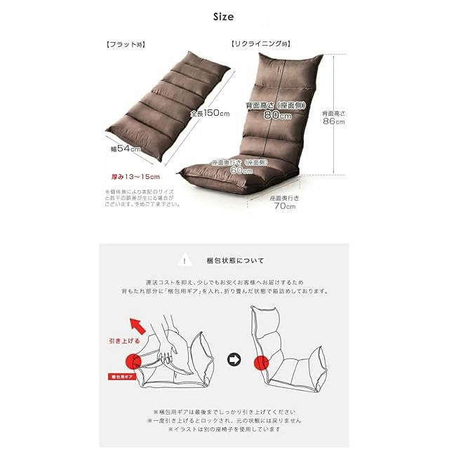 【サイズ】幅54×奥行84×高さ86cm(フラット時:幅54×奥行150×厚み13~15cm) ※サイズはカバー生地の端まで含めた寸法です。