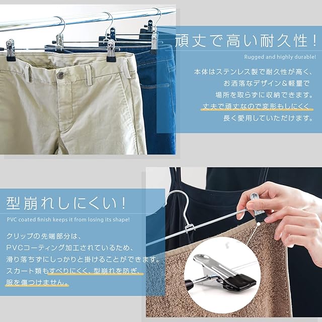 <p><b>PVCクリップで滑り落ちずにしっかりと固定!<br> ズボンやスカート、マフラーなど様々な用途に適したハンガー!</b></p> <p>高い耐久性、位置調整可能が可能な可動式クリップ、シンプルでとても使いやすいズボンハンガー!<br> クリップにPVCコーティング加工で衣類にやさしく、ハンガーからズレ落ちを防ぎます。<br> 大人用から子供用衣類はもちろん、スカートやマフラー、タオル、インナー小物などいろいろなシーンで大活躍!</p> <ul> <li><b>ステンレス製で丈夫で頑丈!</b><br> 本体はステンレス製で耐久性が高く、お洒落なデザイン&軽量で場所を取らずに収納できます。<br> 丈夫で頑丈なので変形もしにくく長く愛用していただけます。</li> <li><b>PVC加工ですべりにくい!</b><br> クリップの先端部分はPVCコーティング加工されているため、滑り落ちずにしっかりと掛けることができます。<br> スカート類もすべりにくく、型崩れを防ぎ、服を傷つけません。</li> <li><b>可動式クリップで位置調整可能!</b><br> クリップは可動式で衣類の幅に合わせて位置を簡単に移動できます。<br> 大人用衣類から子供用まで幅広い衣類に対応し、様々な用途に適したハンガーです。</li> <li><b>両端PVC加工!</b><br> クリップの部分だけでなく、ハンガーの両端にもPVCコーティング加工がされているので、紐付きの衣類を掛けやすくずれ落ちる心配がありません。</li> <li><b>軽量&シンプル設計!</b><br> シンプルで実用的なデザイン、とてもスリムでクローゼット収納力抜群です。<br> 衣類の型崩れを防ぎ、スリッパやインナー小物など様々な物にも適しています。</li> </ul> <p>仕様<br> ●材質:ステンレス、PVC<br> ●重量:(約)40g<br> ●サイズ:(約)30cm×11cm<br> ●カラー:シルバー(PVC加工部/ブラック)<br> ※個体差やロット・モニター環境等により、色味やサイズが若干表記と異なる場合がございます。</p>