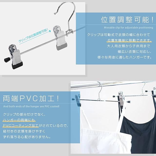 【可動式クリップで位置調整可能!】クリップは可動式で衣類の幅に合わせて位置を簡単に移動できます。大人用衣類から子供用まで幅広い衣類に対応し、様々な用途に適したハンガーです。