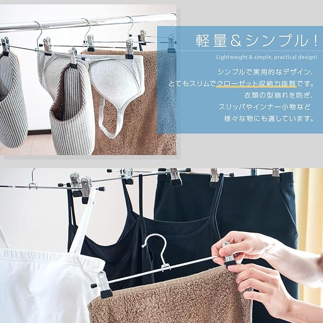 【可動式クリップで位置調整可能!】クリップは可動式で衣類の幅に合わせて位置を簡単に移動できます。大人用衣類から子供用まで幅広い衣類に対応し、様々な用途に適したハンガーです。