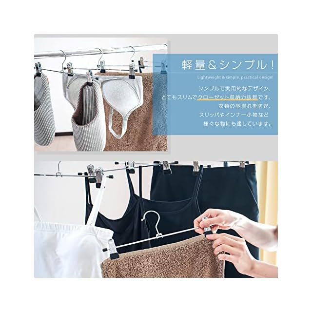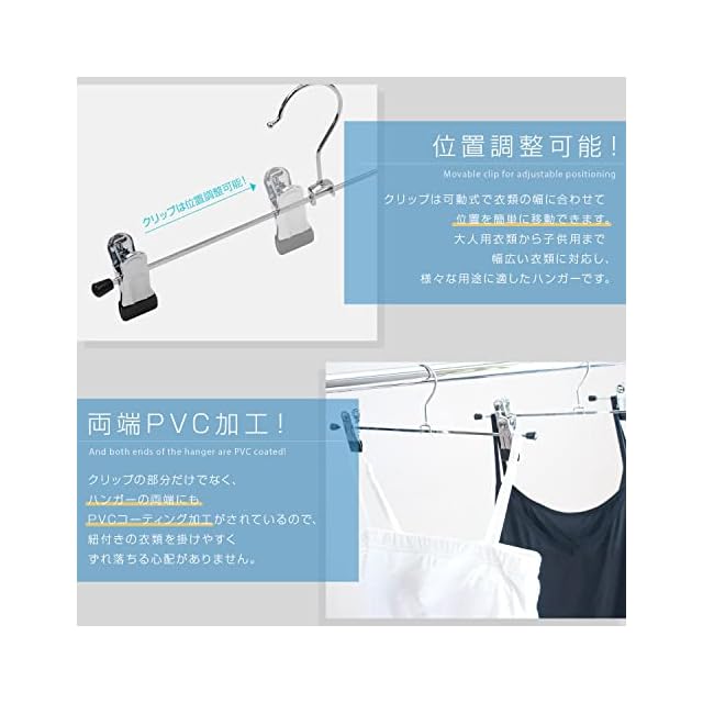 【可動式クリップで位置調整可能!】クリップは可動式で衣類の幅に合わせて位置を簡単に移動できます。大人用衣類から子供用まで幅広い衣類に対応し、様々な用途に適したハンガーです。