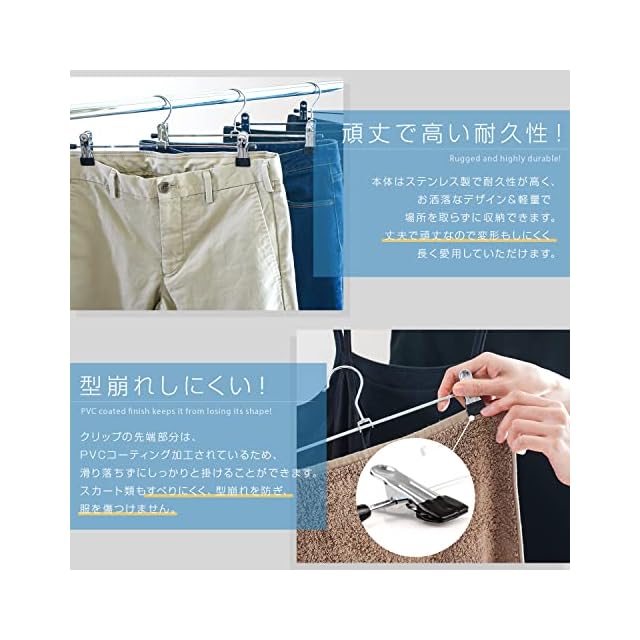<p><b>PVCクリップで滑り落ちずにしっかりと固定!<br> ズボンやスカート、マフラーなど様々な用途に適したハンガー!</b></p> <p>高い耐久性、位置調整可能が可能な可動式クリップ、シンプルでとても使いやすいズボンハンガー!<br> クリップにPVCコーティング加工で衣類にやさしく、ハンガーからズレ落ちを防ぎます。<br> 大人用から子供用衣類はもちろん、スカートやマフラー、タオル、インナー小物などいろいろなシーンで大活躍!</p> <ul> <li><b>ステンレス製で丈夫で頑丈!</b><br> 本体はステンレス製で耐久性が高く、お洒落なデザイン&軽量で場所を取らずに収納できます。<br> 丈夫で頑丈なので変形もしにくく長く愛用していただけます。</li> <li><b>PVC加工ですべりにくい!</b><br> クリップの先端部分はPVCコーティング加工されているため、滑り落ちずにしっかりと掛けることができます。<br> スカート類もすべりにくく、型崩れを防ぎ、服を傷つけません。</li> <li><b>可動式クリップで位置調整可能!</b><br> クリップは可動式で衣類の幅に合わせて位置を簡単に移動できます。<br> 大人用衣類から子供用まで幅広い衣類に対応し、様々な用途に適したハンガーです。</li> <li><b>両端PVC加工!</b><br> クリップの部分だけでなく、ハンガーの両端にもPVCコーティング加工がされているので、紐付きの衣類を掛けやすくずれ落ちる心配がありません。</li> <li><b>軽量&シンプル設計!</b><br> シンプルで実用的なデザイン、とてもスリムでクローゼット収納力抜群です。<br> 衣類の型崩れを防ぎ、スリッパやインナー小物など様々な物にも適しています。</li> </ul> <p>仕様<br> ●材質:ステンレス、PVC<br> ●重量:(約)40g<br> ●サイズ:(約)30cm×11cm<br> ●カラー:シルバー(PVC加工部/ブラック)<br> ※個体差やロット・モニター環境等により、色味やサイズが若干表記と異なる場合がございます。</p>
