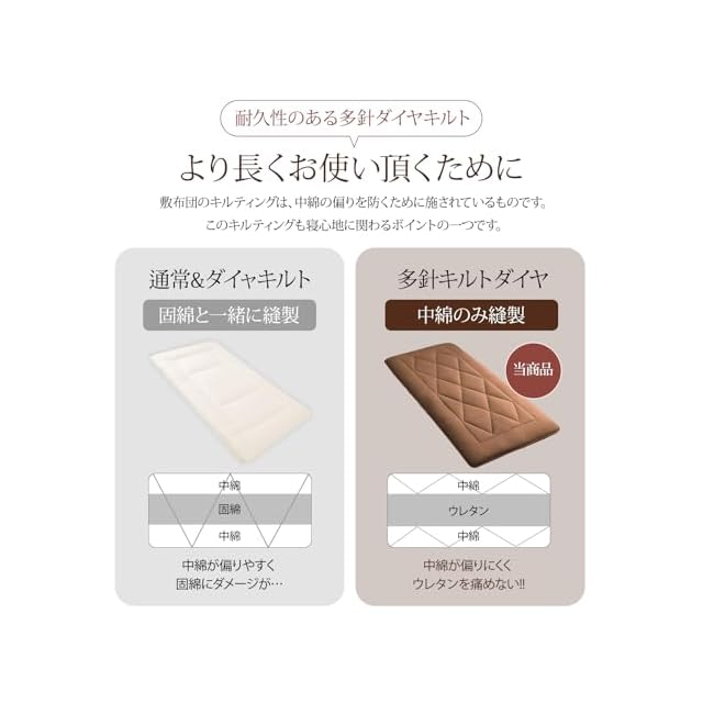 【高反発ウレタン・五層構造敷布団】綿入りのキルト・中綿・ウレタンの五層構造になっているため、しっかり身体を支えるだけでなく、各層の隙間に空気層が出来ることで、通気性にも優れています。厚みは10cmと十分な厚みがあるのに、バランスよく身体を支えてくれるので、ふかふかと柔らかな肌触りを実感できます。
