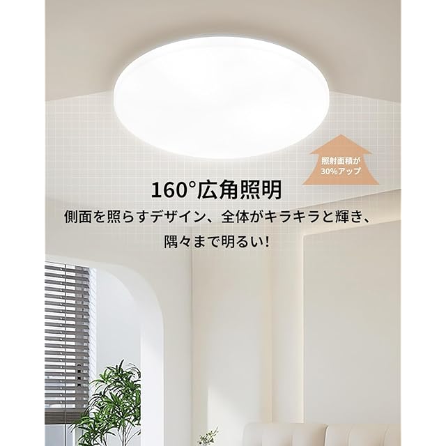 【16畳対応・8000lm高輝度+160°広角照明】48cm大型サイズで16畳18畳の広いリビングや寝室を昼間のように明るく照らします。160°広角設計で部屋の隅々まで均一な光を届け、ソファ周りやキッチンもムラなく明るく。