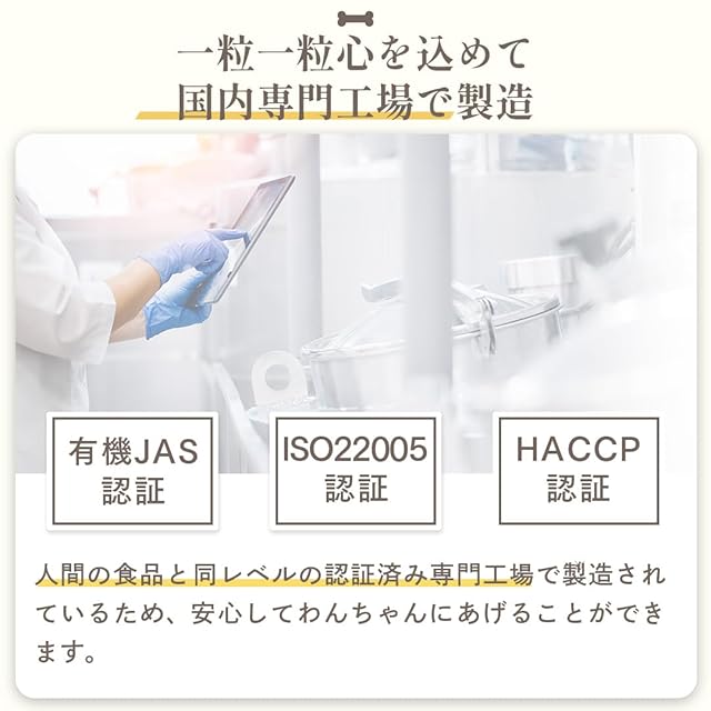 国内の人間用の食品と同等レベルの品質管理である「HACCP認証」や 品質の「ISO22005認証」を取得した工場で製造。安心・安全にこだわったヒューマングレード品質のドッグフードです。