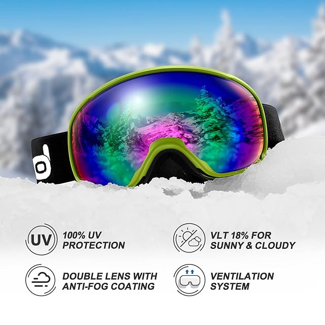 Odoland スキーヘルメットセット ゴーグル付き スノーボードヘルメット ダイヤル式サイズ調整 メガネ対応 ダブル球面レンズ 防風 曇り止め 耐衝撃 UVカット 大人用 男女兼用 子供用 ジュニア グリーン M