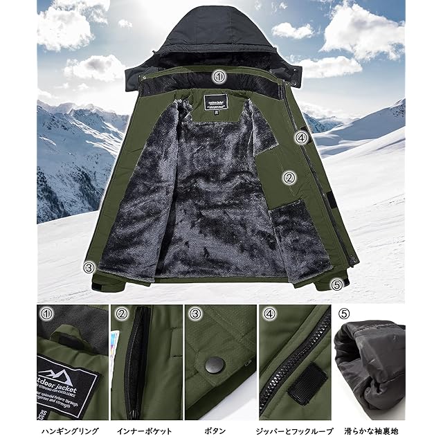 【多機能】1、撥水加工/防汚性/防風性:①防風、防水、防污のある機能性生地を採用します。②ファスナーは防水層デザインを付いて、防水性能を高めます。③ジャケットの継手の所に防水工芸を採用します。 2.防寒性/保温性:裏は裏起毛のデザインです。帽子と袖口の設計も保温性を強めます。 3.通気性/透湿性。