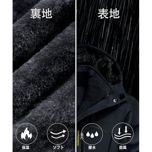 【多機能】1、撥水加工/防汚性/防風性:①防風、防水、防污のある機能性生地を採用します。②ファスナーは防水層デザインを付いて、防水性能を高めます。③ジャケットの継手の所に防水工芸を採用します。 2.防寒性/保温性:裏は裏起毛のデザインです。帽子と袖口の設計も保温性を強めます。 3.通気性/透湿性。