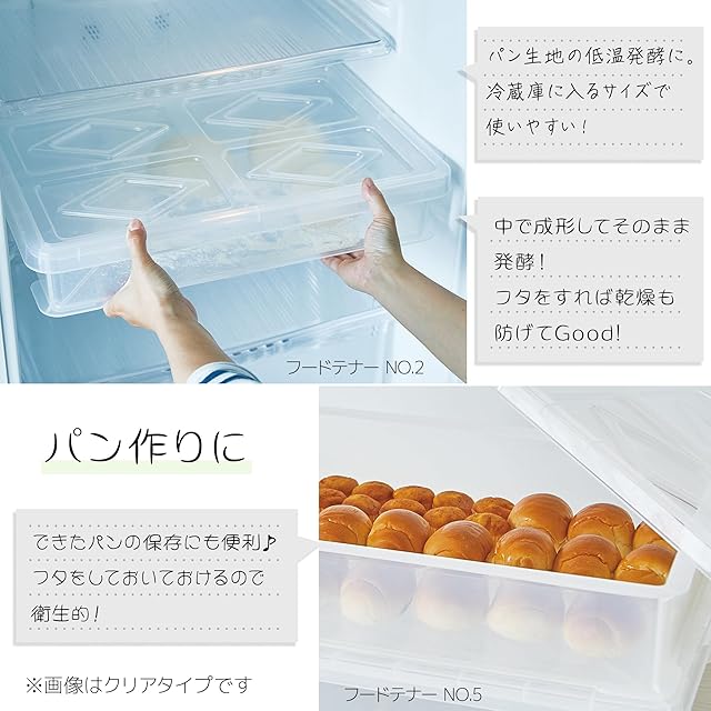 餅・パン・ケーキ・麺類などの一時保存や運搬に便利な平型フードコンテナ。 小型のパンや小餅、製麺に適した浅型タイプ。本体2個とフタ1個のセット。プラレールなどオモチャの収納にも便利。本体のみ。蓋は別売りです。蓋(別売り)をしたままでの積み重ねが可能なので運搬に便利。