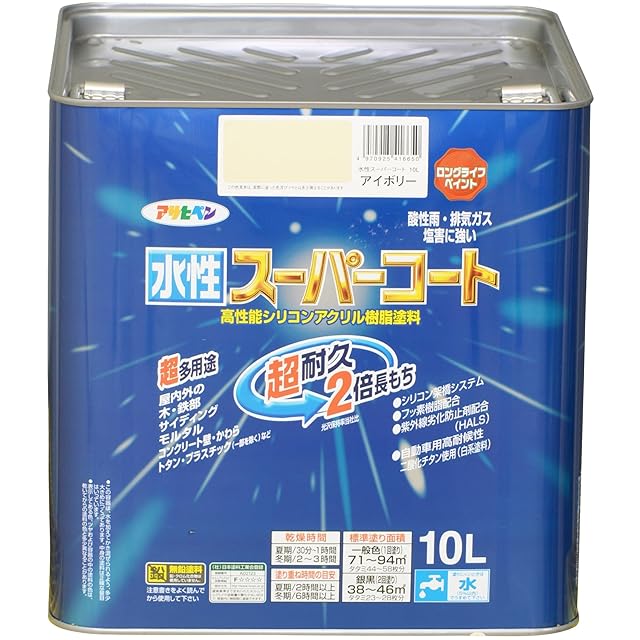 商品名:アサヒペン 水性スーパーコート 10L アイボリー 塗料 ペンキ シリコンアクリル塗料 ツヤあり 1回塗り 超耐久 多用途 さび止め剤配合 防カビ剤配合 紫外線劣化防止剤配合 シックハウス対策品 日本製
