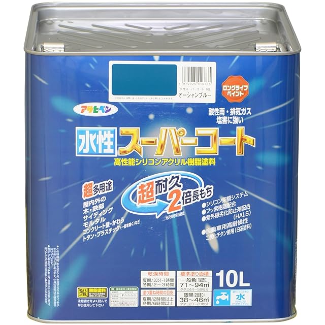 商品名:アサヒペン 水性スーパーコート 10L オーシャンブルー 塗料 ペンキ シリコンアクリル塗料 ツヤあり 1回塗り 超耐久 多用途 さび止め剤配合 防カビ剤配合 紫外線劣化防止剤配合 シックハウス対策品 日本製