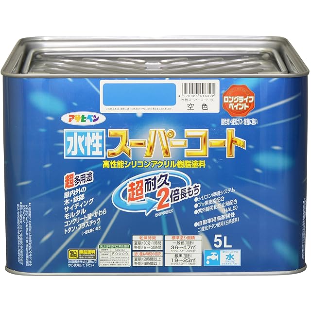 商品名:アサヒペン 水性スーパーコート 5L 空色 塗料 ペンキ シリコンアクリル塗料 ツヤあり 1回塗り 超耐久 多用途 さび止め剤配合 防カビ剤配合 紫外線劣化防止剤配合 シックハウス対策品 日本製