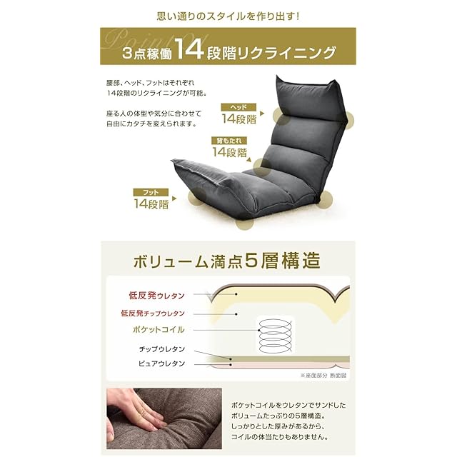 タンスのゲン 座椅子 へたりにくい ポケットコイル 低反発 14段階 リクライニング ブラウン 43000000 94 (77172)