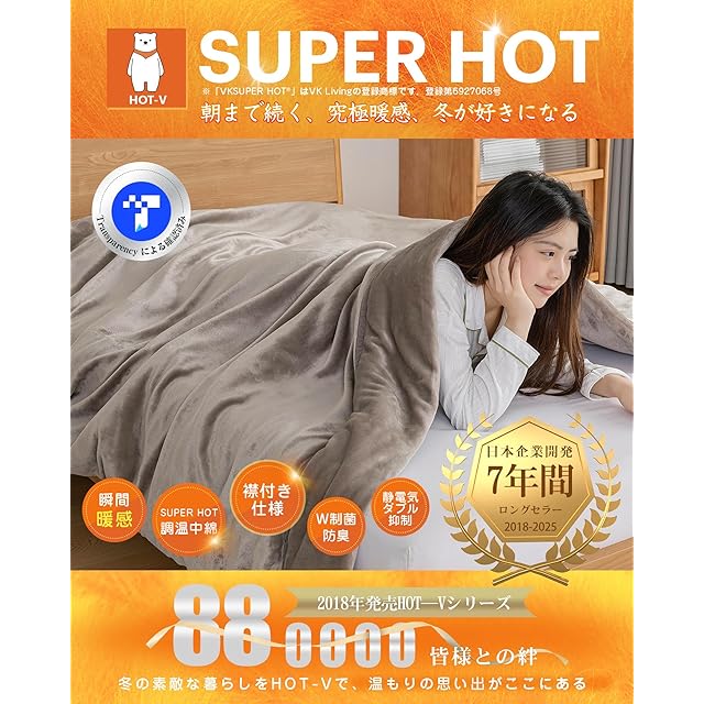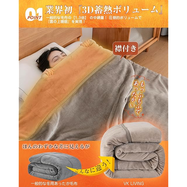 【未来の魔法瓶毛布・快適な温度が長~く続く!】①魔法瓶効果かつ瞬間超発熱の「扁平糸」超高密度フランネル+②VK Livingが独自に開発したSUPER HOT調温中綿+③保湿加工を施したフランネルで、2025年の新技術により創造したこだわりの魔法瓶毛布です。秋から春まで長期間使用でき、季節の変わり目にも重宝します。