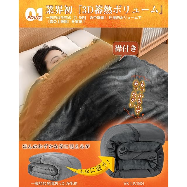 【未来の魔法瓶毛布・快適な温度が長~く続く!】①魔法瓶効果かつ瞬間超発熱の「扁平糸」超高密度フランネル+②VK Livingが独自に開発したSUPER HOT調温中綿+③保湿加工を施したフランネルで、2025年の新技術により創造したこだわりの魔法瓶毛布です。秋から春まで長期間使用でき、季節の変わり目にも重宝します。