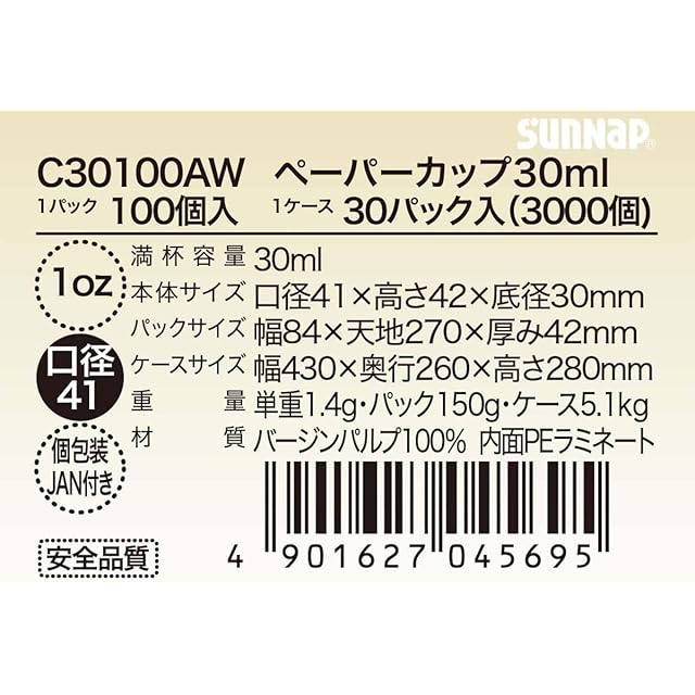 【最小サイズ30ml・口径約41mm】試飲・試食や、うがい用に合う30ml/1オンスの業界最小サイズの紙コップです。 【たっぷり3000個】100個入りのパックが30個入って合計3000個入。たくさん使えてお得な業務用仕様です。