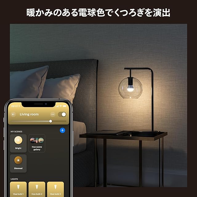 【調光可能な電球色ライト】 Hue ホワイトは温かみのある電球色で、明るさを0~100%でシームレスに調光可能です。スマートフォンやスマートスピーカー、専用リモコンで明るさの調整が簡単にできます。初めてスマート照明を使う方にオススメのエントリーモデルです。