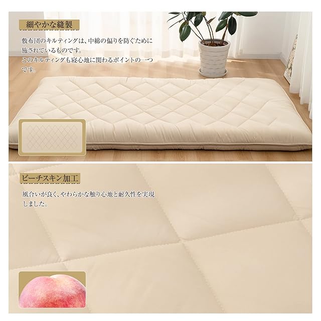 【心地よい肌触り・五層式敷布団】両面の表層はふわふわの中綿で、寝心地も抜群です。不織布は中棉とウレタンを分離し、中棉の形状を維持しやすく、つぶれず、耐久性があります。約5cmのウレタンが体を効果的に支え、敷き布団が崩れにくいです。ウレタンが入っていることで、全身をバランスよく支え、S字の寝姿勢を保ってくれ、快適に眠るとこができます。
