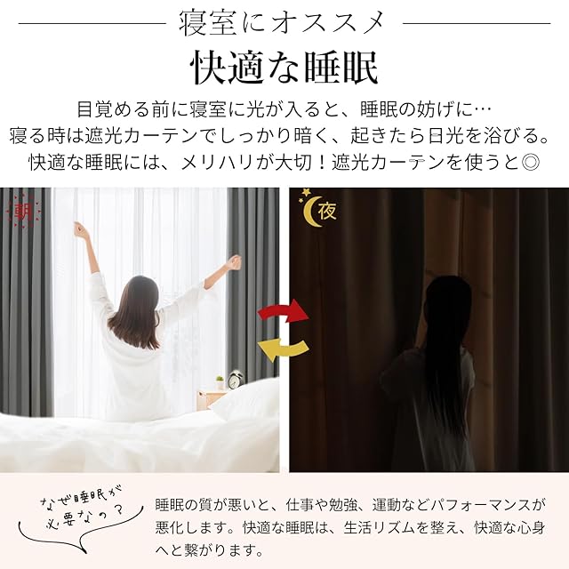 【プライバシーを守る】室内の光を外に漏れにくくする効果があるだけではなく、夜に部屋の明かりを付けている時でも外から人影が見えづらく、プライバシーを守ることができます。女性の一人暮らしでもこのカーテンなら安 心できる