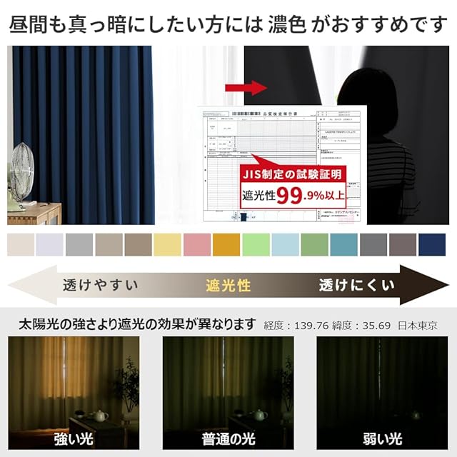 【1級遮光】迷ったらこれ!シンプル&機能性重視の方におすすめです。この2枚セット(1級遮光ドレープカーテン2枚)を選択する理由:①光沢を抑えたマットな質感が美しい。②黒ずみの少ないなめらかな生地。③快適に過ごせる優れた性能。遮光率99.9%以上、日差しの強い窓でもしっかりと遮光できるので、光をできる限りシャットアウトしたい方におすすめです。