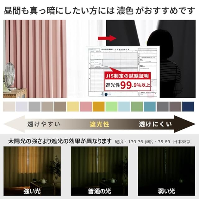 【1級遮光】迷ったらこれ!シンプル&機能性重視の方におすすめです。この2枚セット(1級遮光ドレープカーテン2枚)を選択する理由:①光沢を抑えたマットな質感が美しい。②黒ずみの少ないなめらかな生地。③快適に過ごせる優れた性能。遮光率99.9%以上、日差しの強い窓でもしっかりと遮光できるので、光をできる限りシャットアウトしたい方におすすめです。