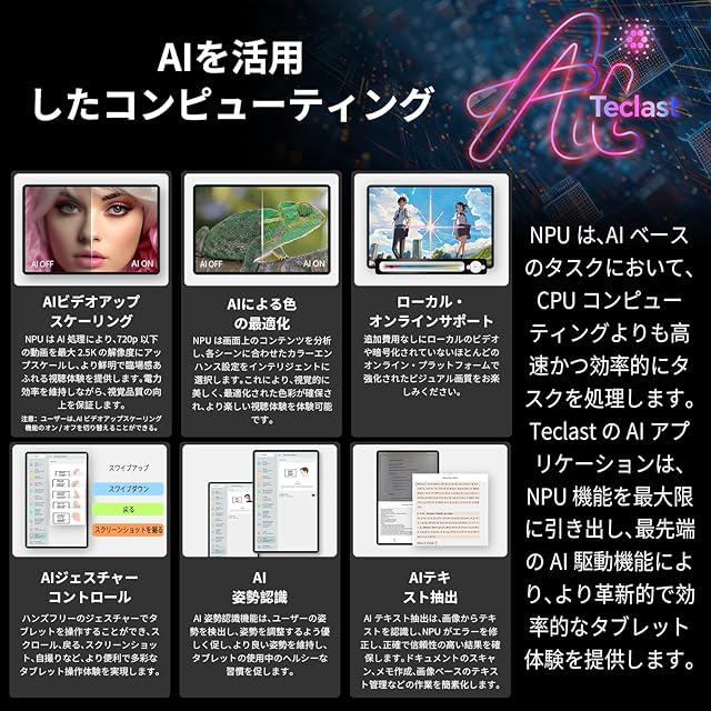 【AIシリーズ初のタブレット,TECLAST T60 AI アンドロイド15 タブレット12インチ登場、Widevine L1 対応】Teclast独自のAI技術を搭載したT60 AIタブレットは、AIシリーズ初のタブレットで、インテリジェントな機能と高度なパフォーマンスを提供します。従来はCPUの消費電力が大きい演算処理も、独立したNPUを搭載することで低消費電力で実現できる場合がありました。 そこで弊社では、NPUを深く活用し、高効率なAi演算を行うインテリジェントなAPPを開発することで、タブレットの使用感を向上させ、より斬新な遊び方を提案します。Ai 革新的で知的な新しい体験:① Ai-SRビデオ最適化;②Ai姿勢認識;③Aiエアージェスチャー;④PCモード;⑤Ai文字認識抽出など。このAndroid15タブレットは新機能が多いので、問題があればいつでも弊社に連絡して解決してください。T60AI アンドロイド15タブレット12インチは、Widevine L1をサポートしており、世界中の30以上の主要なビデオアプリでの高品質なビデオ再生を楽しむことができます。