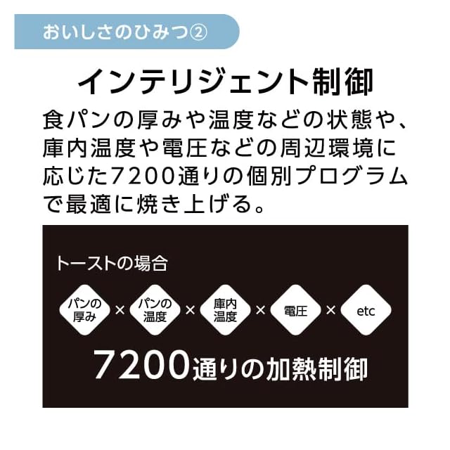 庫内温度や周辺環境に応じた7200通りのプログラムで、厚切りも、冷凍も、外はサクッ、中はふんわりあつあつのトーストを実現。