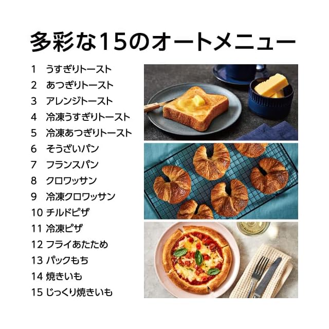 アレンジトースト、フランスパンあたため、じっくり焼きいもを新搭載し、オートメニューが充実。具材をのせたアレンジトースト、具入りフランスパンにも対応。クロワッサン、焼きいもなど多彩なメニューが自動で焼ける。