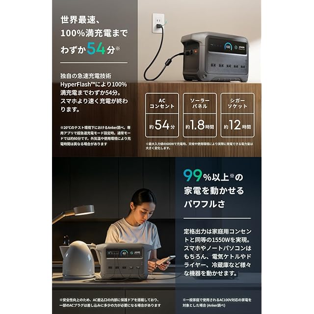 99%以上※の家電を動かせるパワフルさ:定格出力は家庭用コンセントと同等の1550Wを実現。スマホやノートパソコンはもちろん、電気ケトルやドライヤー、冷蔵庫など様々な機器を動かせます。 ※一般家庭で使用されるAC100V対応の家電を対象とした場合 (Anker調べ)。
