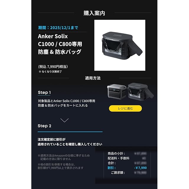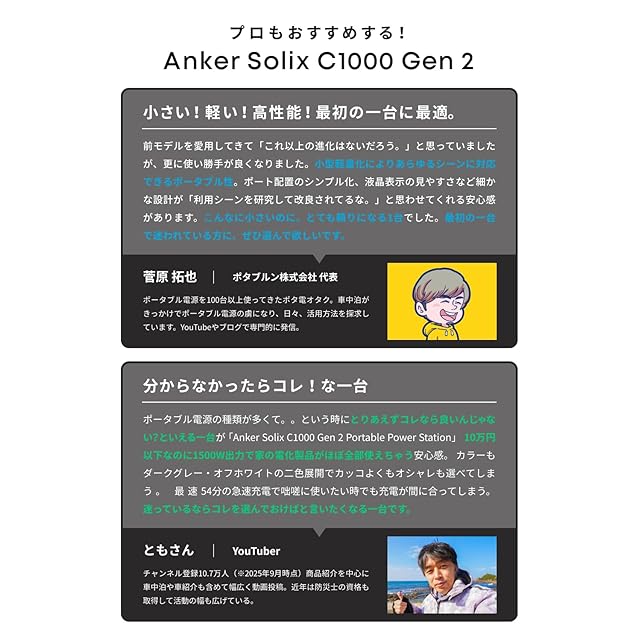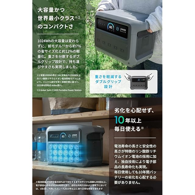 すべてにちょうどいい、世界最小クラス※のポータブル電源:1000Wh以上の大容量は変わらずに、 Best Seller獲得実績もある前モデル (Anker Solix C1000 Portable Power Station) から一回り省サイズ化し約12%の軽量化を実現した世界最小クラスのポータブル電源です。※容量1000Wh帯かつAC定格出力1500W以上のリン酸鉄リチウムイオン電池搭載モデルにおいて。ハンドル部分を除く体積計算に基づく。 (2025年4月時点 Anker調べ)。